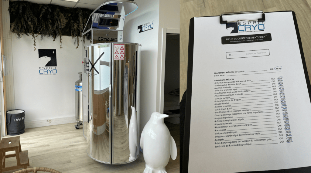 Pour une première séance, il faut compter 30/45 minutes. On est invité à remplir un questionnaire pour s’assurer que l’on n’a pas de maladie (insuffisance respiratoire, hypertension, antécédent d’AVC…) ni de traitement médical en cours pour lesquels la cryothérapie est contre-indiquée. En effet, le choc thermique intense sollicite fortement l’organisme, ce qui peut être dangereux en présence de troubles cardio vasculaires, circulatoires, ou d’autres affections aiguës ou chroniques sensibles au froid.